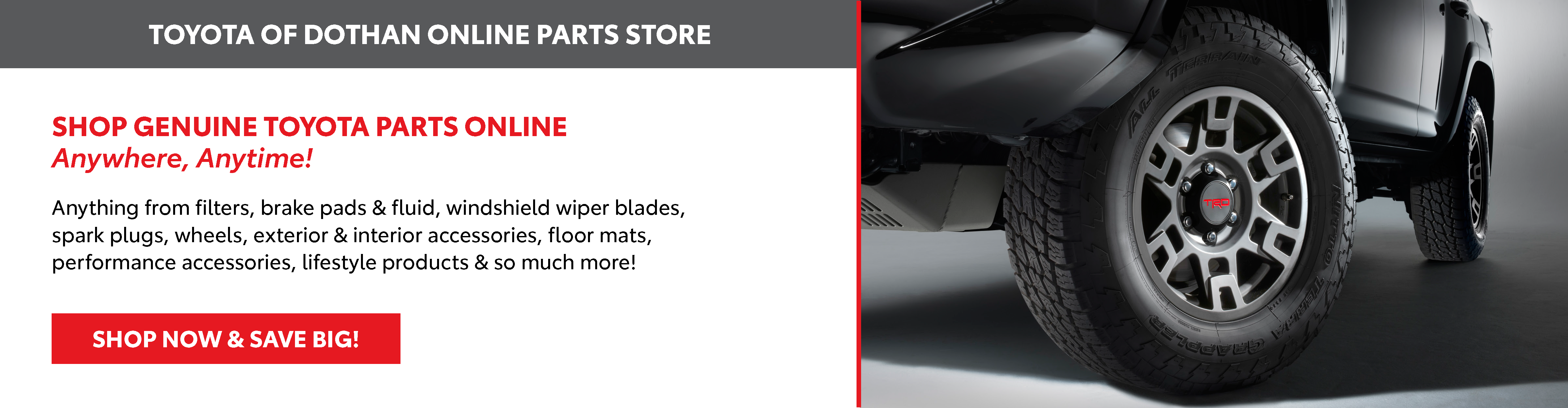 Here at Toyota of Dothan, we also offer a comprehensive selection of OEM Toyota parts and accessories, so you can touch up or accessorize your vehicle exactly how you want to do so. Plus, if you're looking for a part or accessory that we don't have in our current inventory, we'll gladly locate that item and order it for you! You have the option of picking it up at our dealership, or we can have it delivered directly to you.