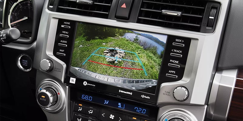 When backing up, the area visible to the camera is displayed on the 8-in. touchscreen. 4Runner’s available front and rear parking assist sonar beeps to tell you how close the bumpers are from a detected object. The faster it beeps, the closer the object is. And 4Runner’s available Panoramic View Monitor (PVM) uses cameras on the front, sides and rear to give you a 360-degree view of what’s going on outside.