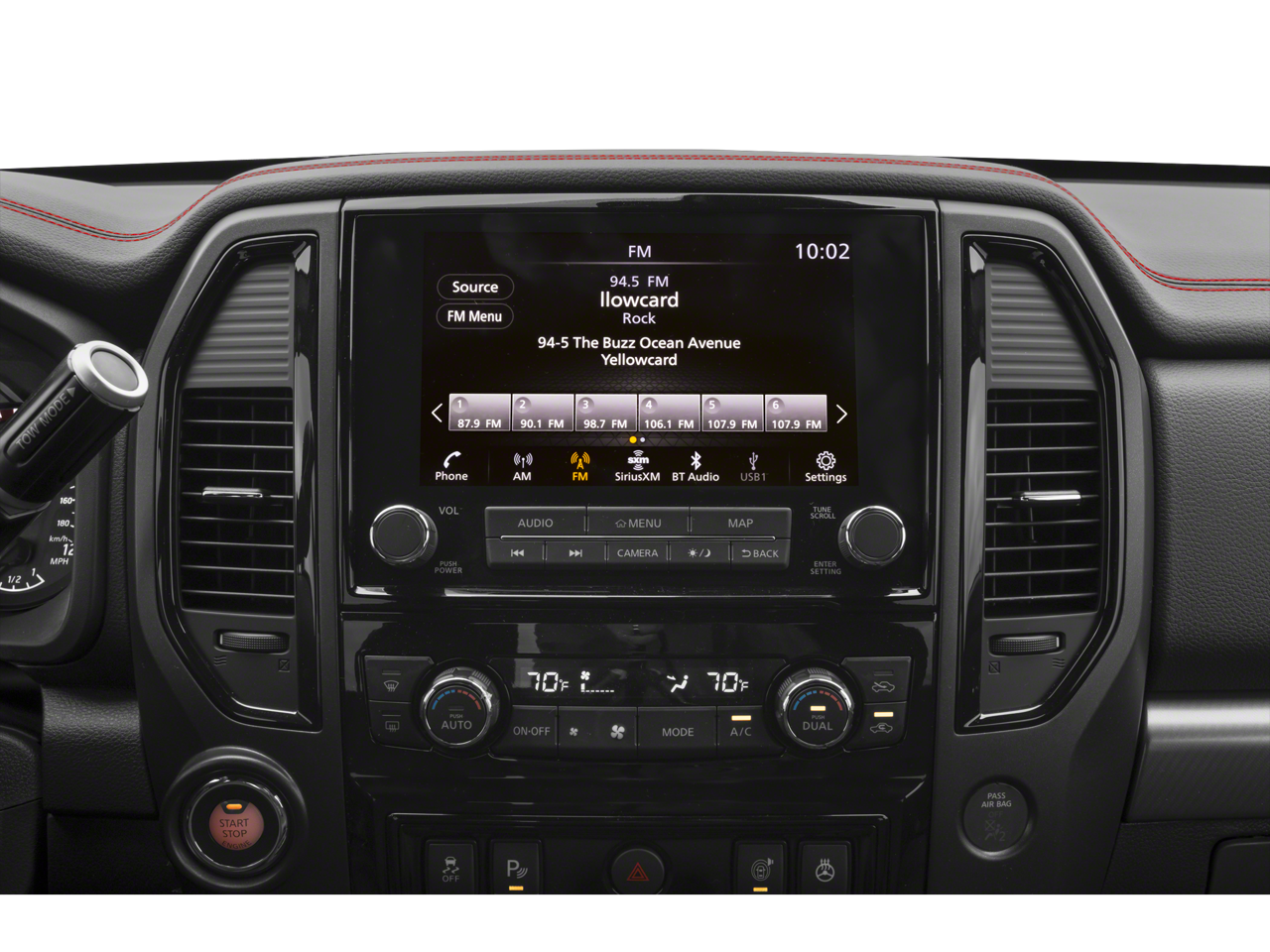 - Radio: NissanConnect w/Navigation -inc: 9" touchscreen display, 6 speakers, wireless Apple CarPlay, Android Auto, SiriusXM radio, SiriusXM Traffic, SiriusXM Travel Link w/weather, fuel prices, movie listings, stock info, sports and parking, TomTom weather, Nissan door to door navigation w/3D building graphics and satellite imagery, connected navigation features including online POI search, over-the-air map updates and online premium traffic information, 2 illuminated USB (1 type A, 1 type C) connection ports for iPod interface, Bluetooth® hands-free phone system, streaming audio via Bluetooth®, hands-free text messaging assistant, Nissan voice recognition for navigation and audio and Siri Eyes Free